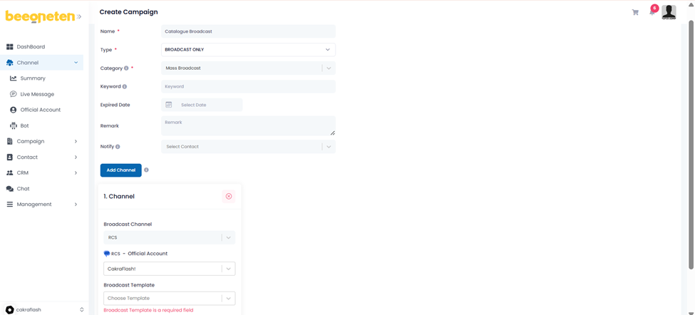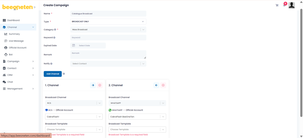 | 1 | Channel Mandatory | Select channel you would like to use for sending message Note: Do not use 1 single rcs account for 2 bulk campaigns running at the same time, because it will cause template conflict and wrong content transmission. | Viber bot Viber RCS Apple Facebook |