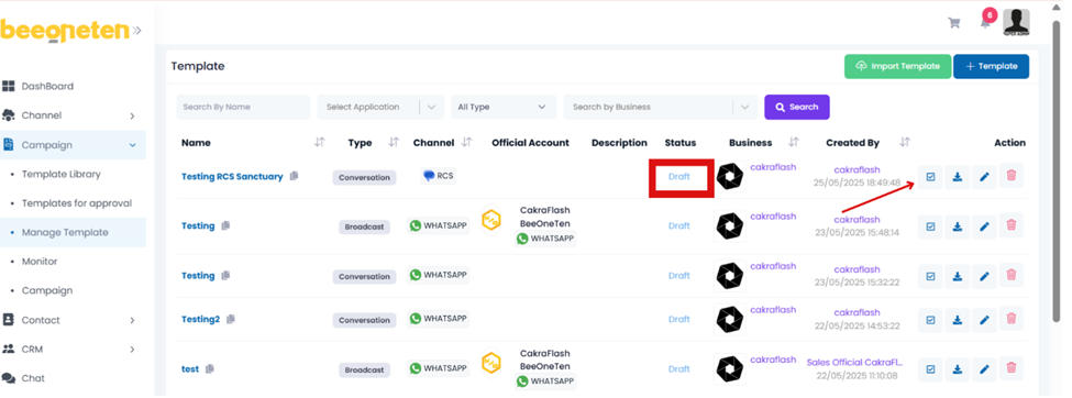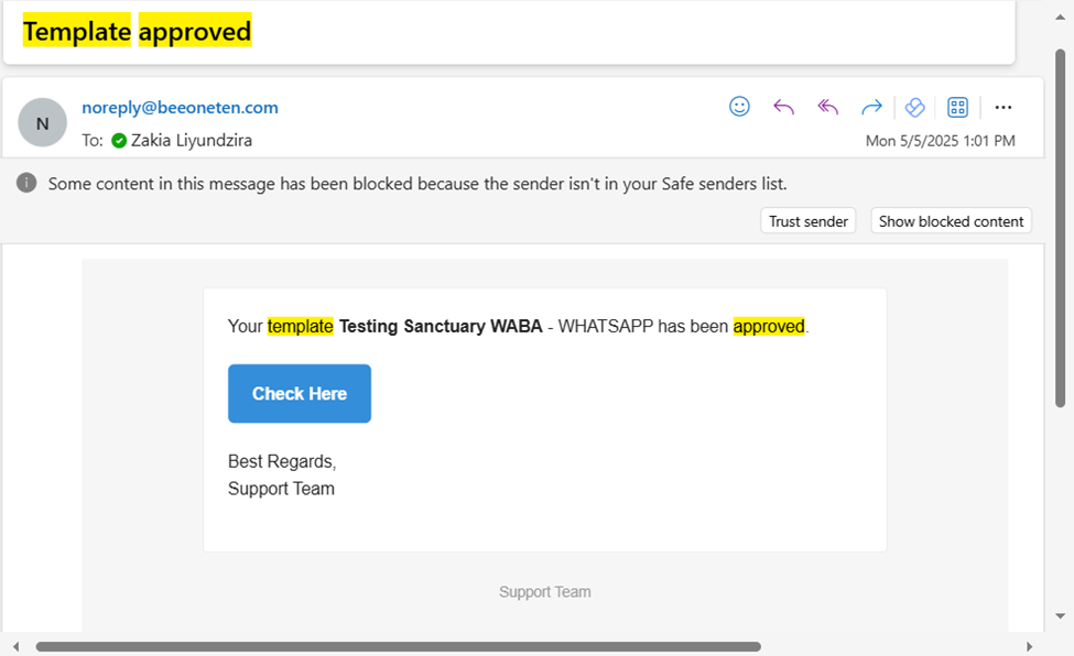 - Finally, when Beeoneten approves it, the status will change to Approved and you will receive an email notifying you that your template has been approved.