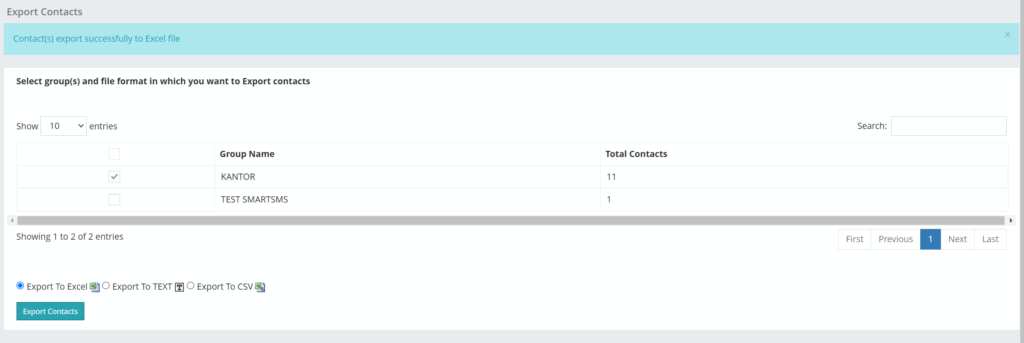 Export Contacts feature provides users with a convenient way to retrieve contacts from specific groups and export them in various file formats (.xls/.csv/.txt). This section outlines the simple process for exporting contacts.